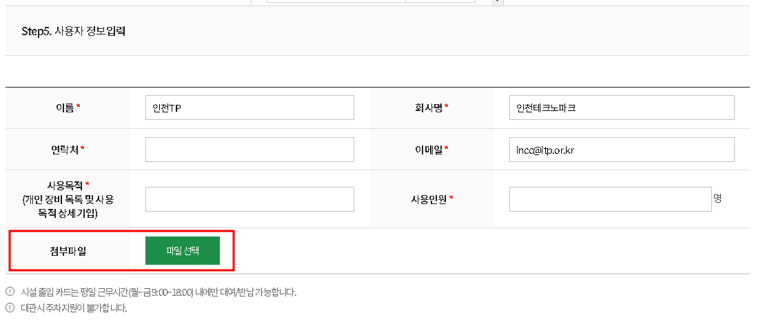 □ 주요내용: 홈페이지 대관 신청 시 첨부파일에 해당 양식 작성, 사인 후 스캔본 첨부(Step5. 사용자 정보입력 하단)