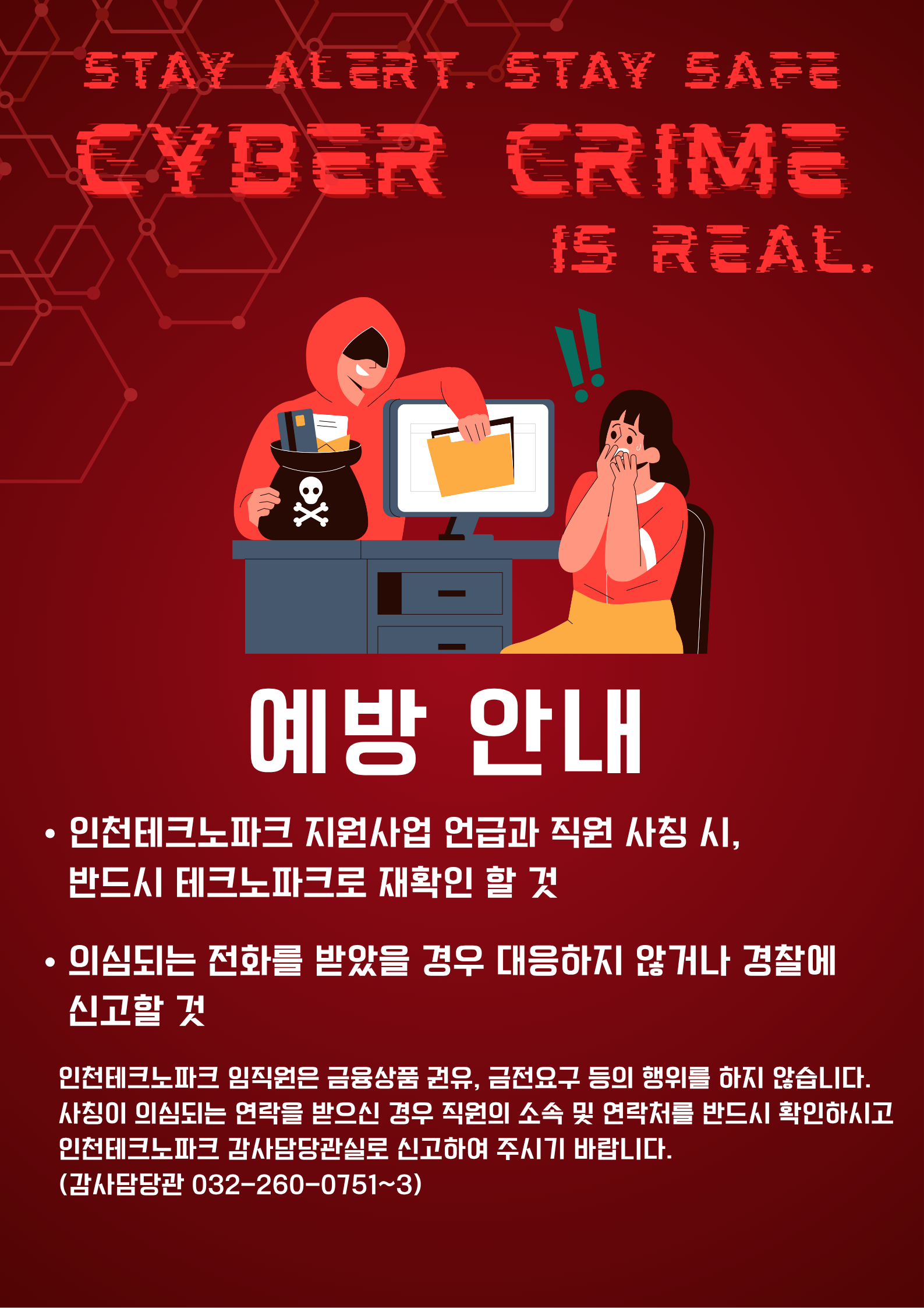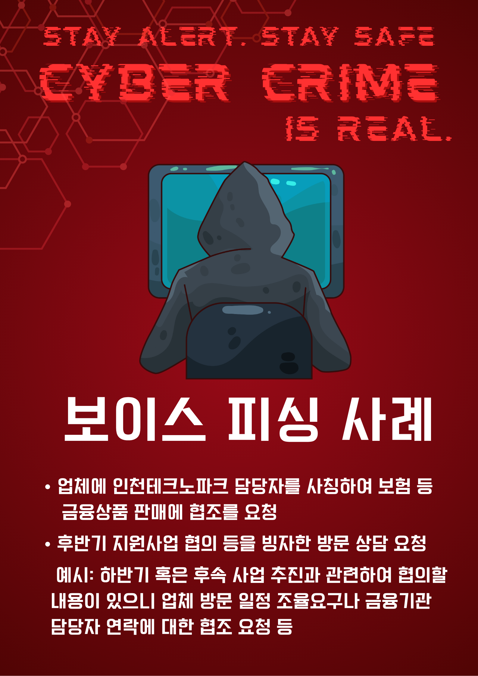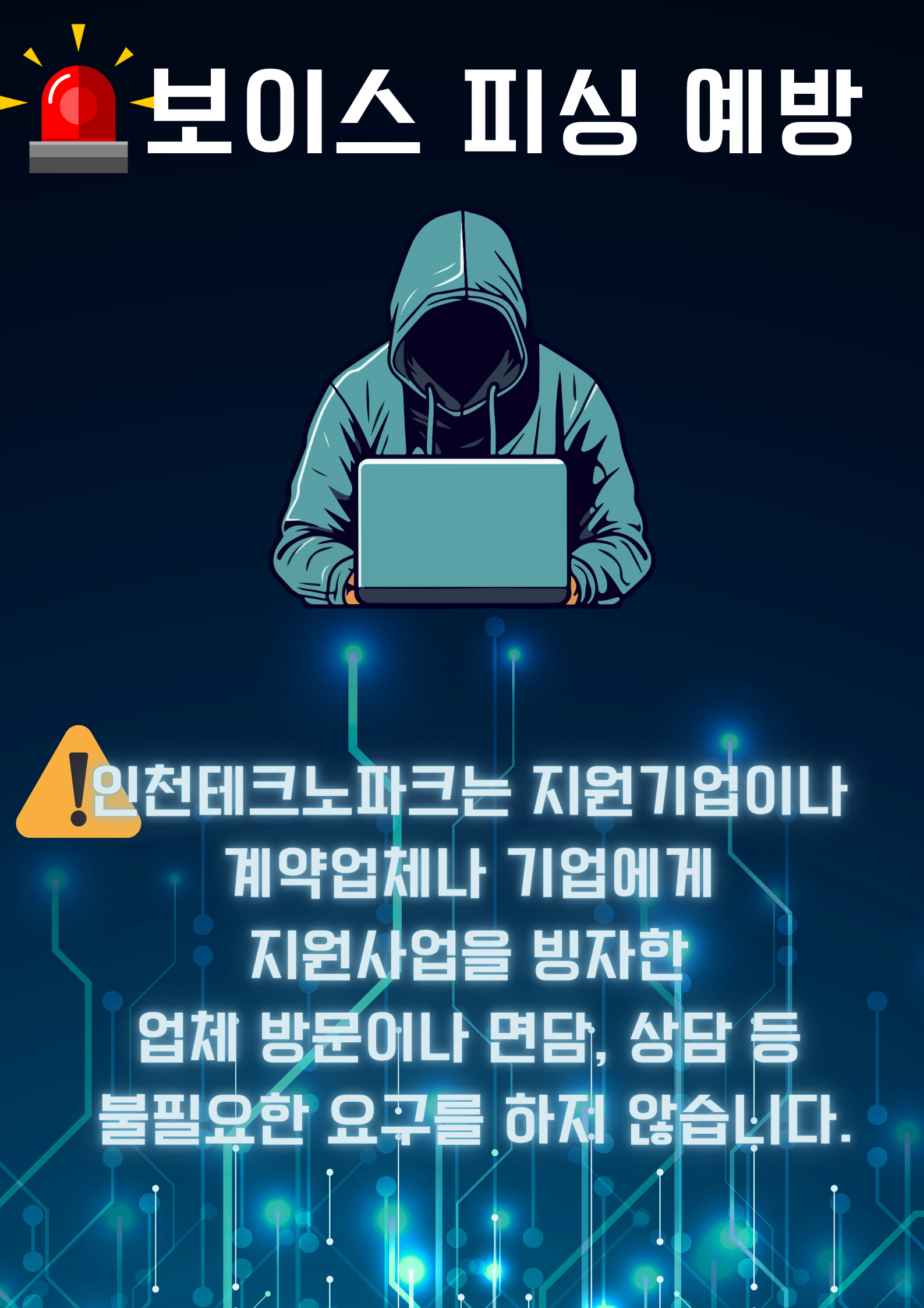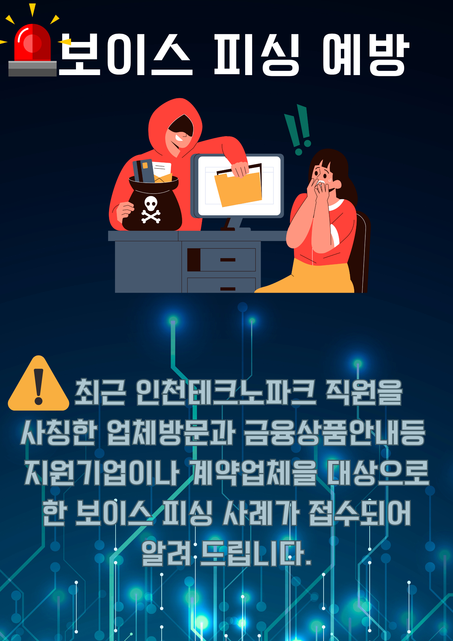 최근 인천테크노파크 직원을 사칭한 업체방문과 금융상품 안내 등 지원기업이나 계약업체을 대상으로 한 보이스 피싱 사례가 접수되어 알려 드립니다.