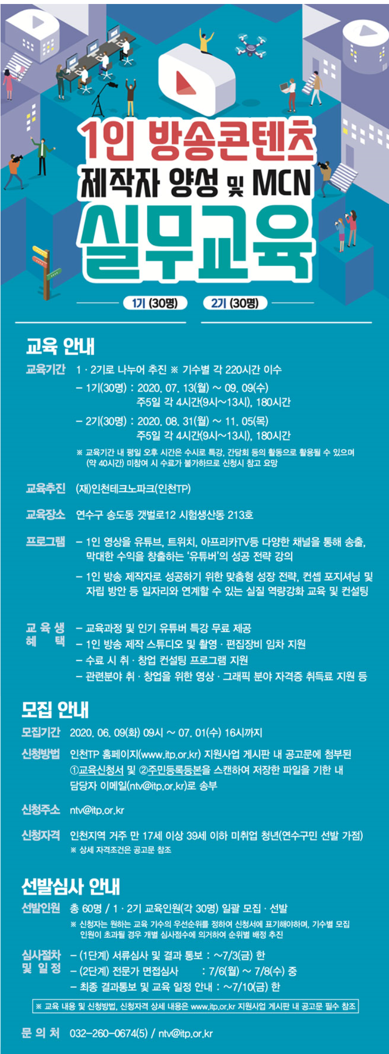 “인천광역시와 연수구가 주관하며 (재)인천테크노파크가 추진하는 1인 방송 제작자 양성 및 일자리 연계 프로그램인 1인 방송콘텐츠 제작자 양성 및 MCN 실무교육 추진을 위하여